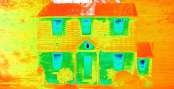 Bei der Thermografie werden unterschiedliche Oberflächentemperaturen mittels Infrarot-Wärmestrahlung erfasst und in verschiedenen Farben dargestellt. So können thermische Eigenschaften eines Gebäudes sichtbar gemacht werden.